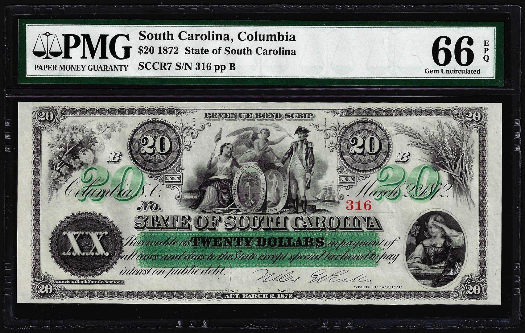 One 1872 $20 State of South Carolina Revenue Bond Obsolete Note PMG Gem Uncirculated 66EPQ. PMG Certified.
