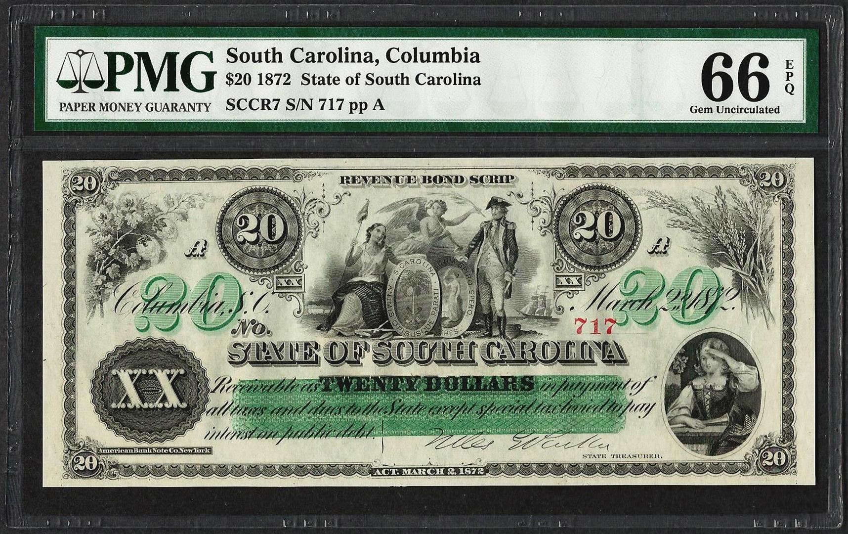One 1872 $20 State of South Carolina Revenue Bond Obsolete Note PMG Gem Uncirculated 66EPQ. PMG Certified.