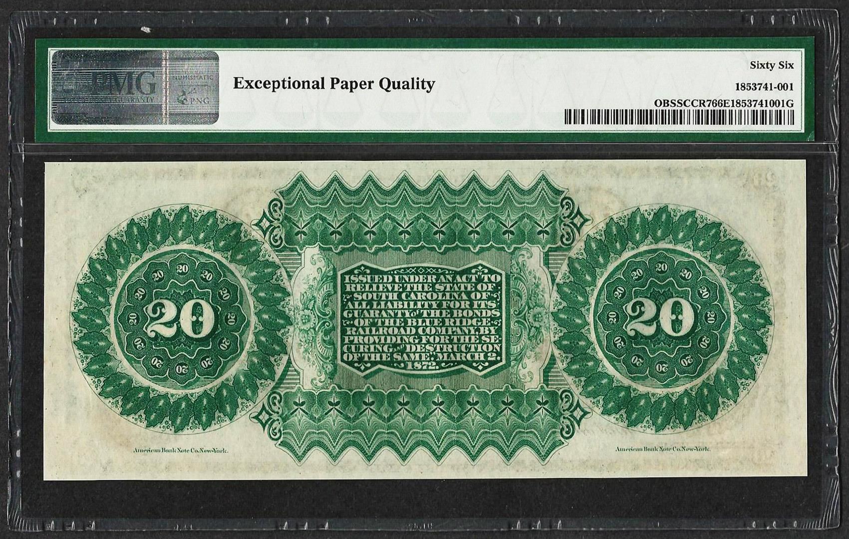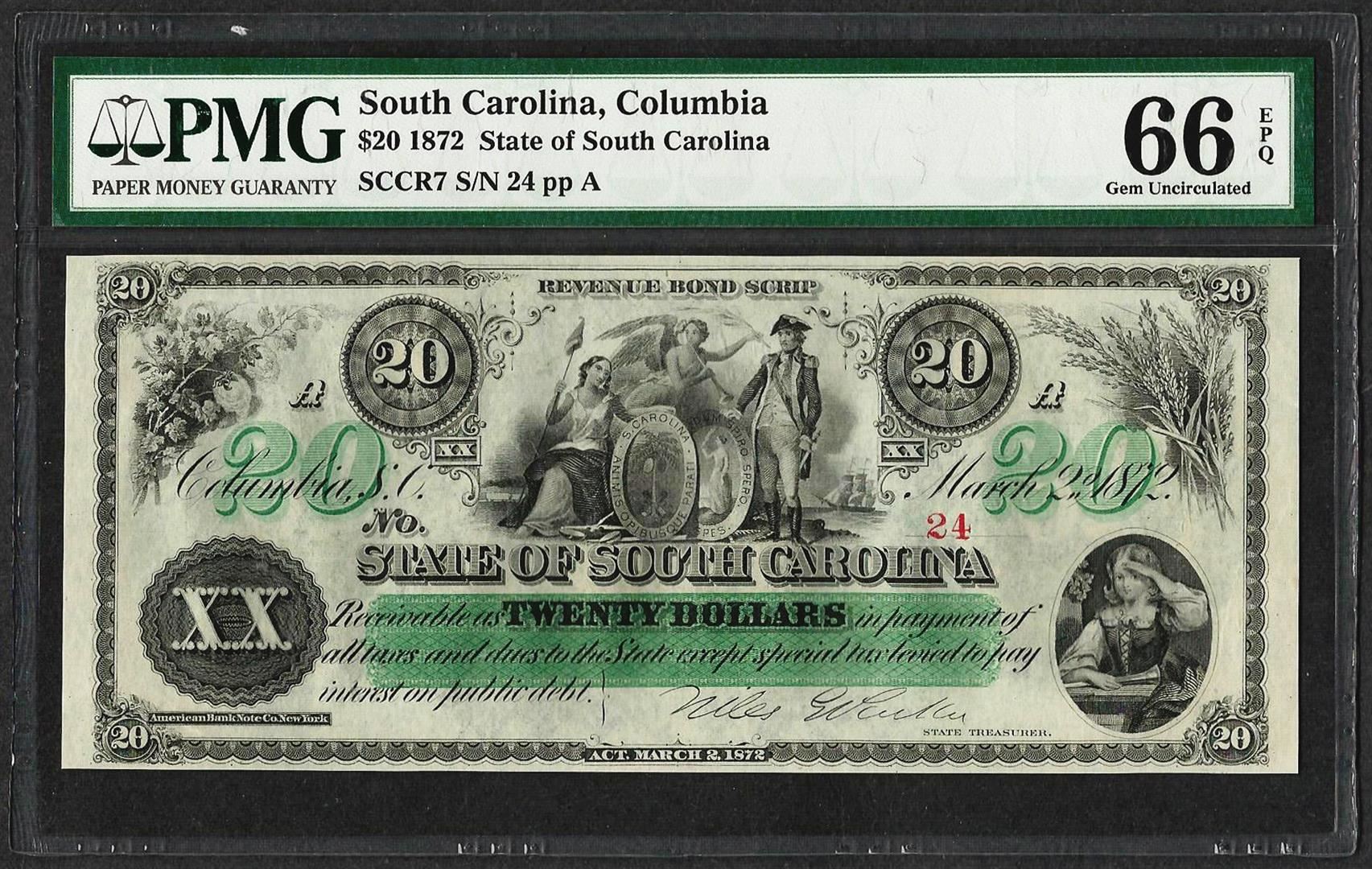 One 1872 $20 State of South Carolina Revenue Bond Obsolete Note PMG Gem Uncirculated 66EPQ. PMG Certified.