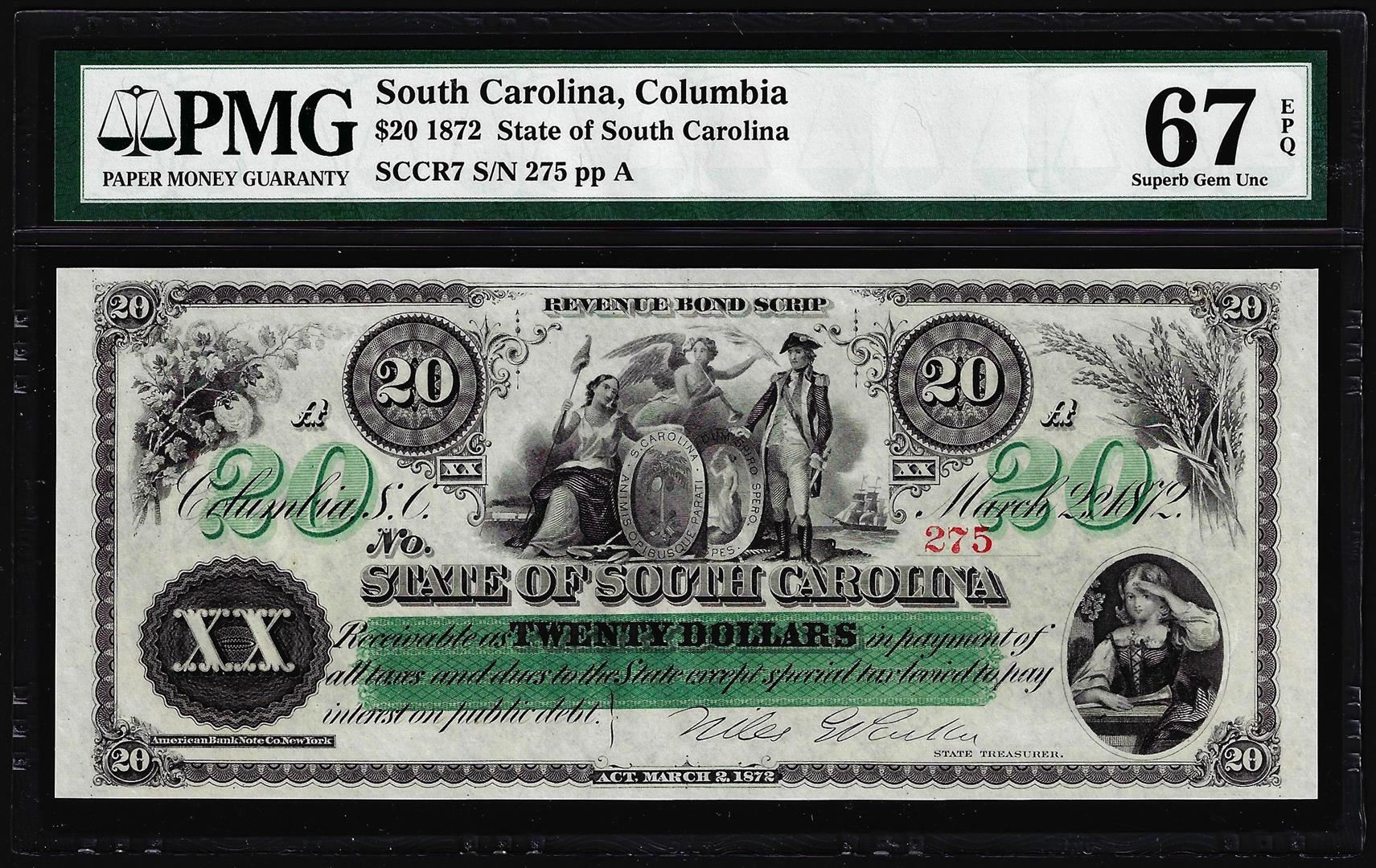 One 1872 $20 State of South Carolina Revenue Bond Obsolete Note PMG Superb Gem Uncirculated 67EPQ. PMG Certified.