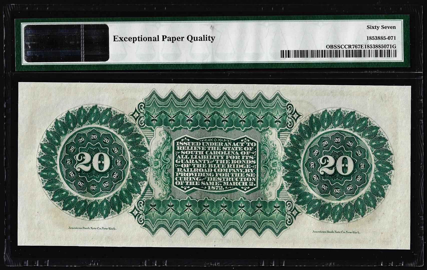One 1872 $20 State of South Carolina Revenue Bond Obsolete Note PMG Superb Gem Uncirculated 67EPQ. PMG Certified.