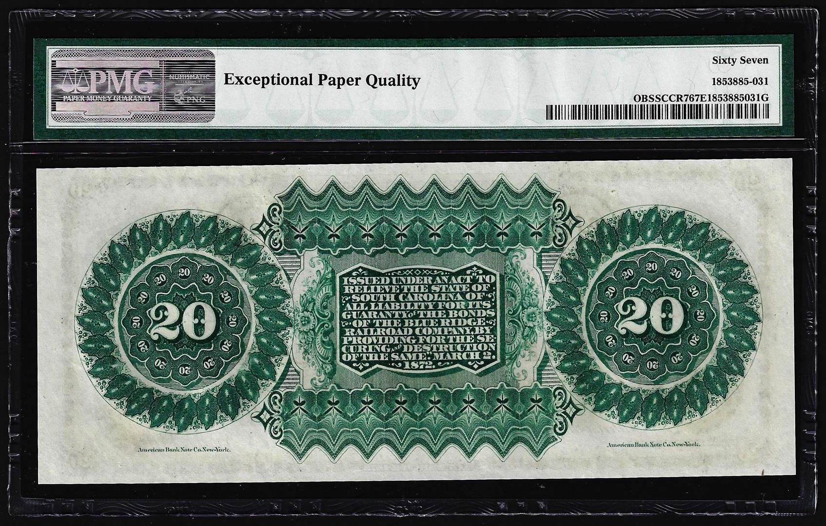 1872 $20 State of South Carolina Revenue Bond Obsolete Note PMG Superb Gem Unc. 67EPQ