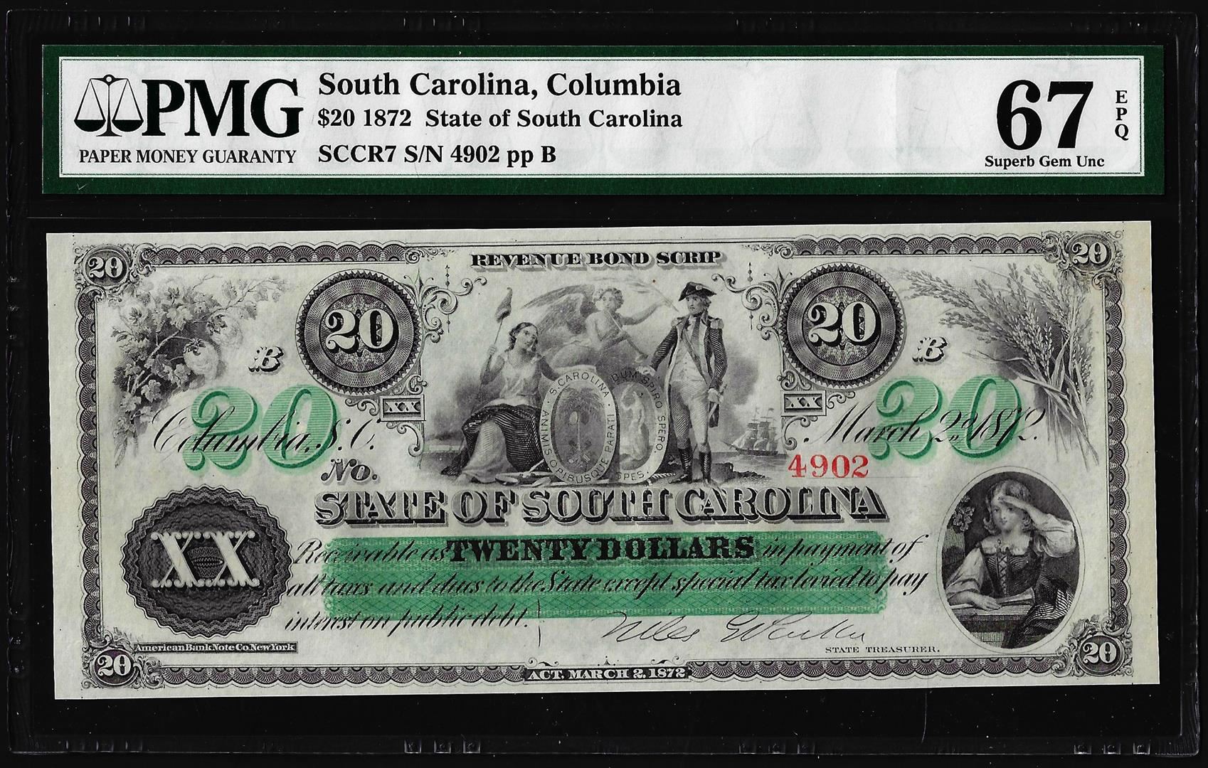 1872 $20 State of South Carolina Revenue Bond Obsolete Note PMG Superb Gem Unc. 67EPQ