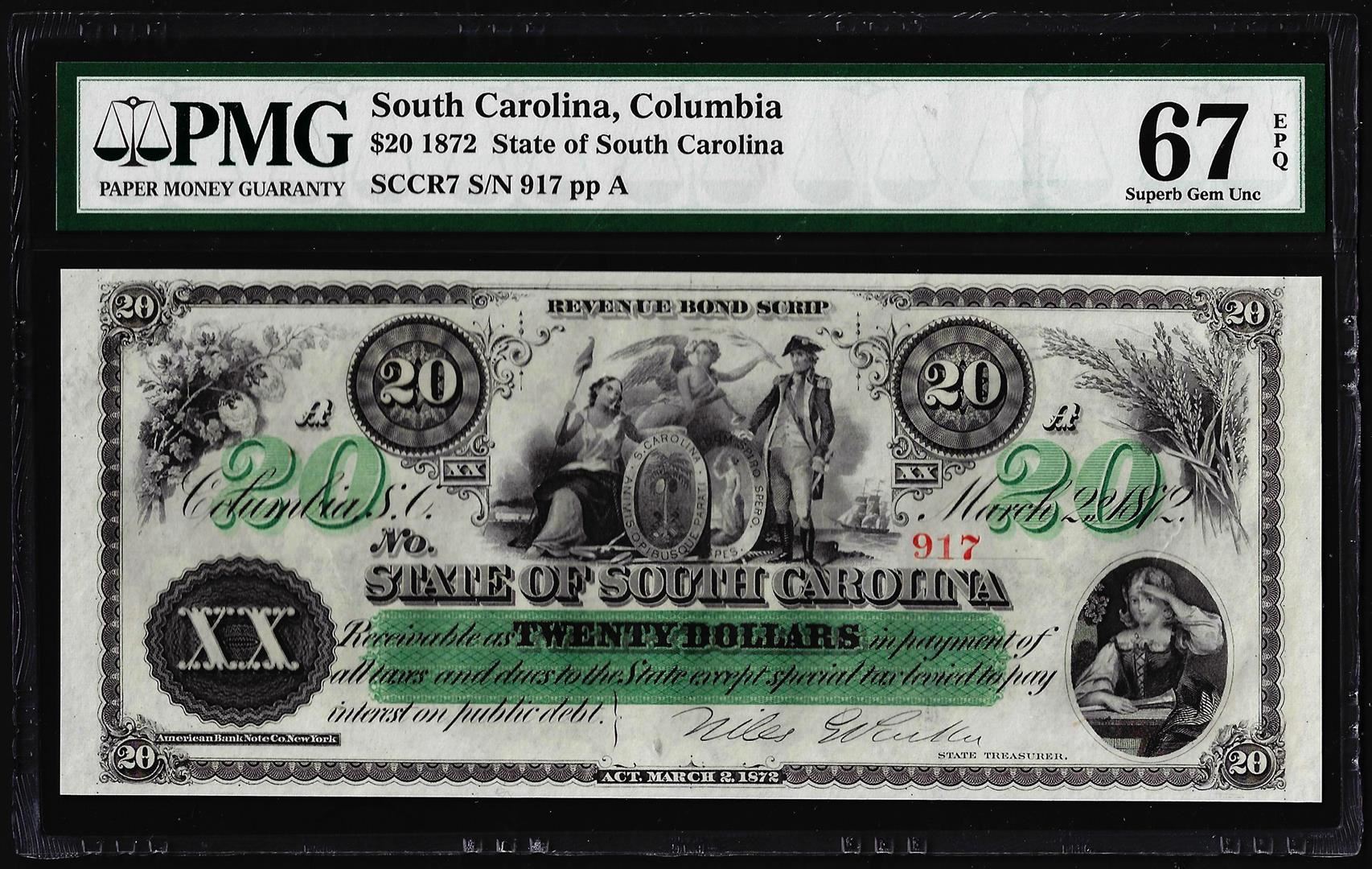 1872 $20 State of South Carolina Revenue Bond Obsolete Note PMG Superb Gem Unc. 67EPQ