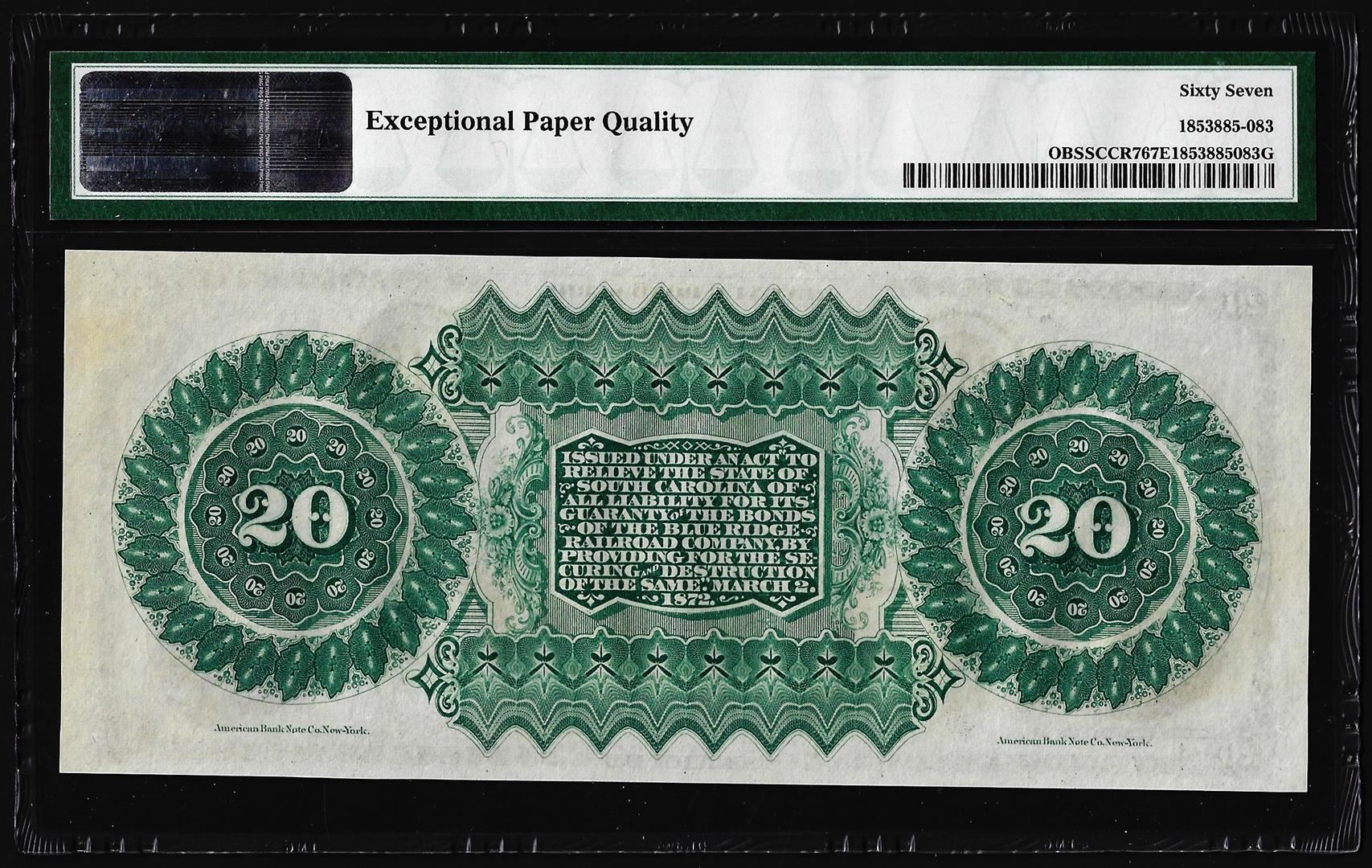1872 $20 State of South Carolina Revenue Bond Obsolete Note PMG Superb Gem Unc. 67EPQ