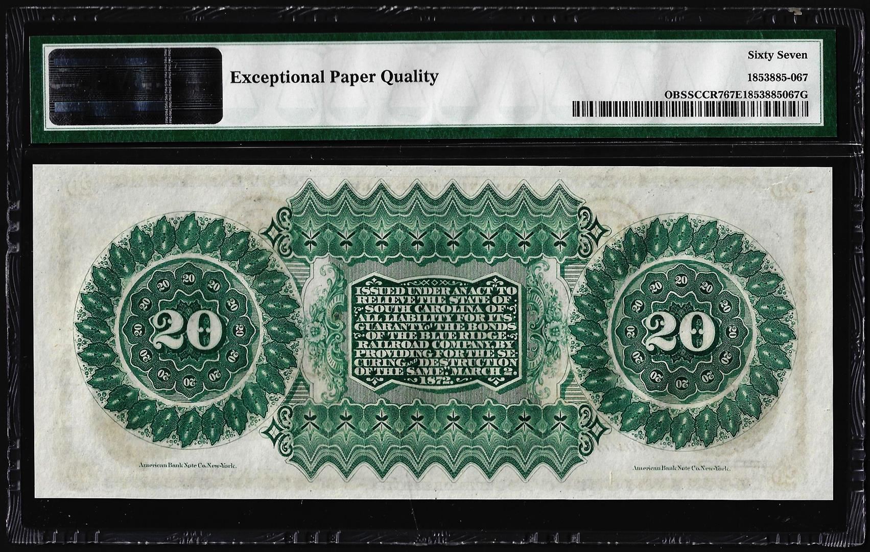 1872 $20 State of South Carolina Revenue Bond Obsolete Note PMG Superb Gem Unc. 67EPQ