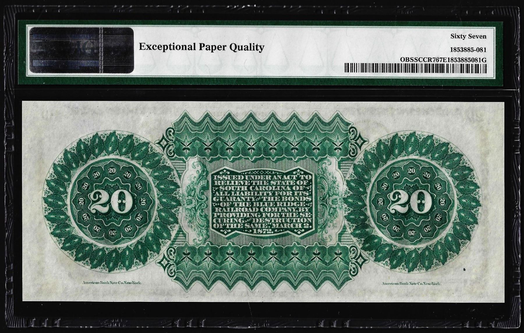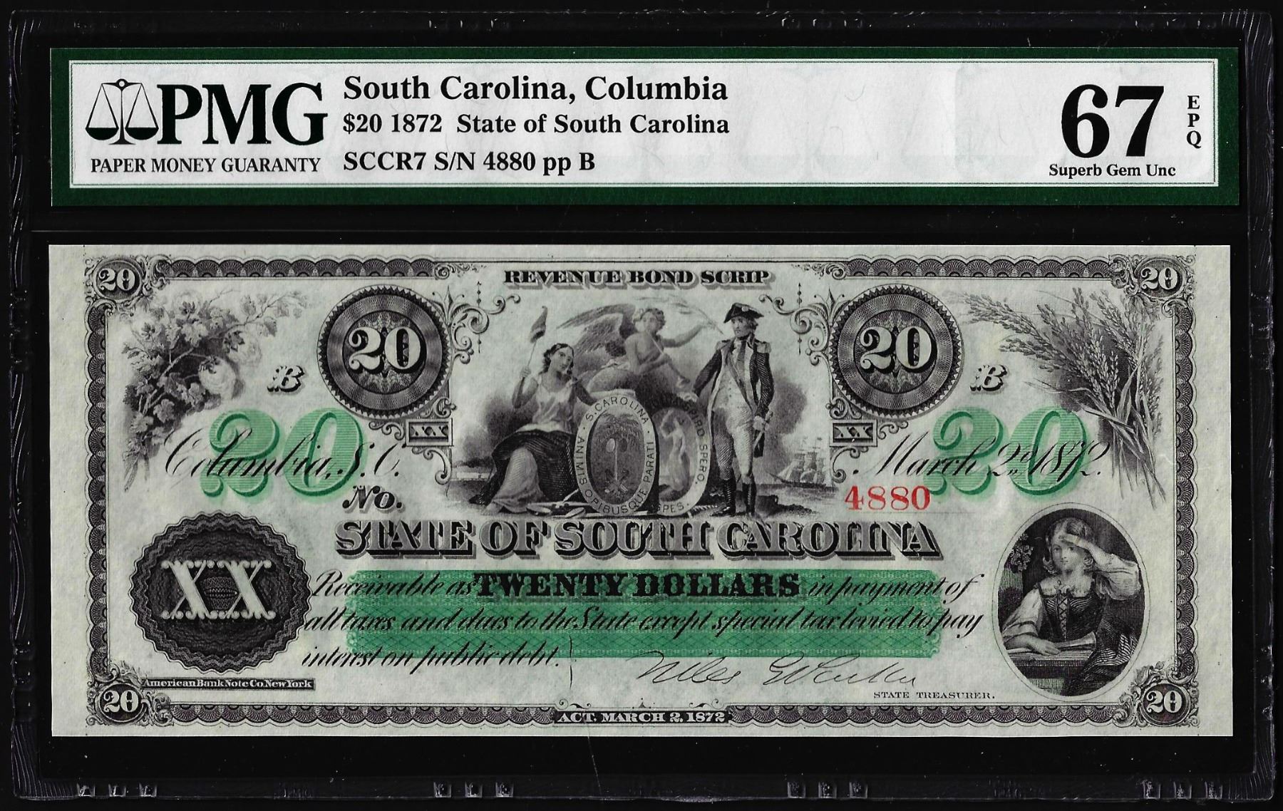 1872 $20 State of South Carolina Revenue Bond Obsolete Note PMG Superb Gem Unc. 67EPQ