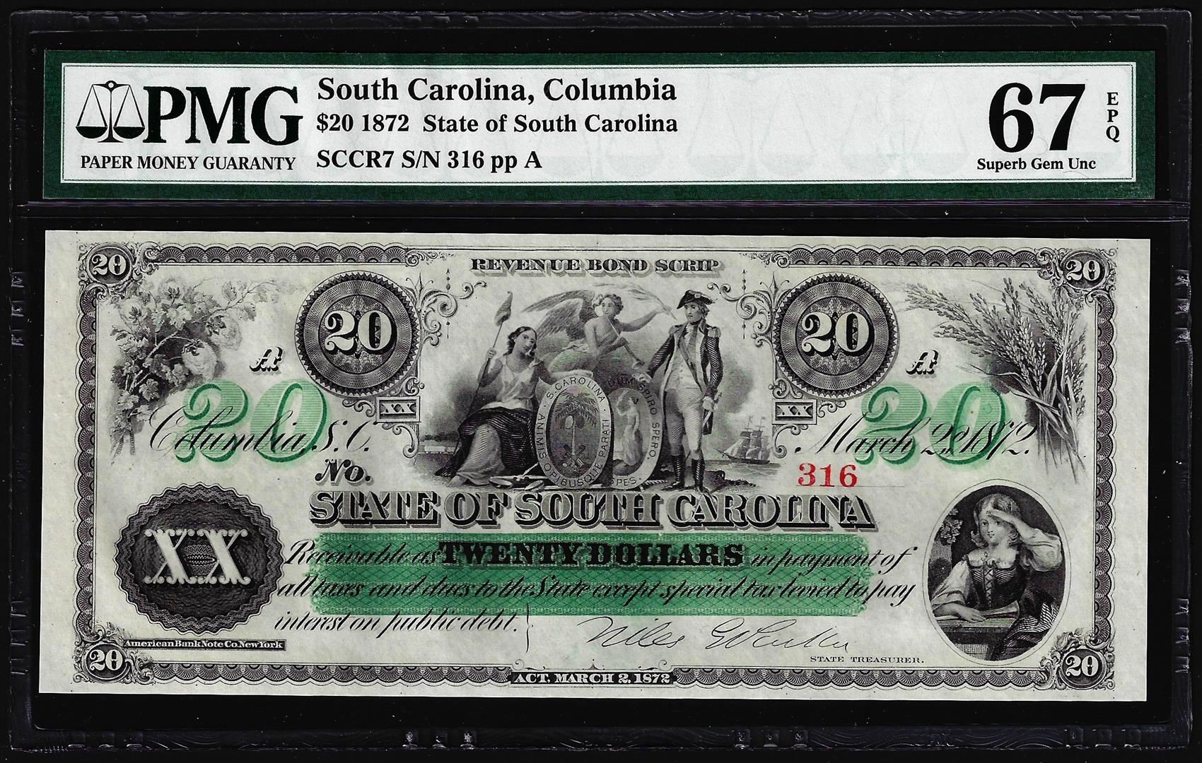 One 1872 $20 State of South Carolina Revenue Bond Obsolete Note PMG Superb Gem Uncirculated 67EPQ. PMG Certified.