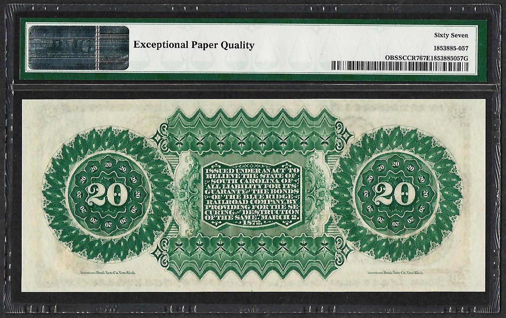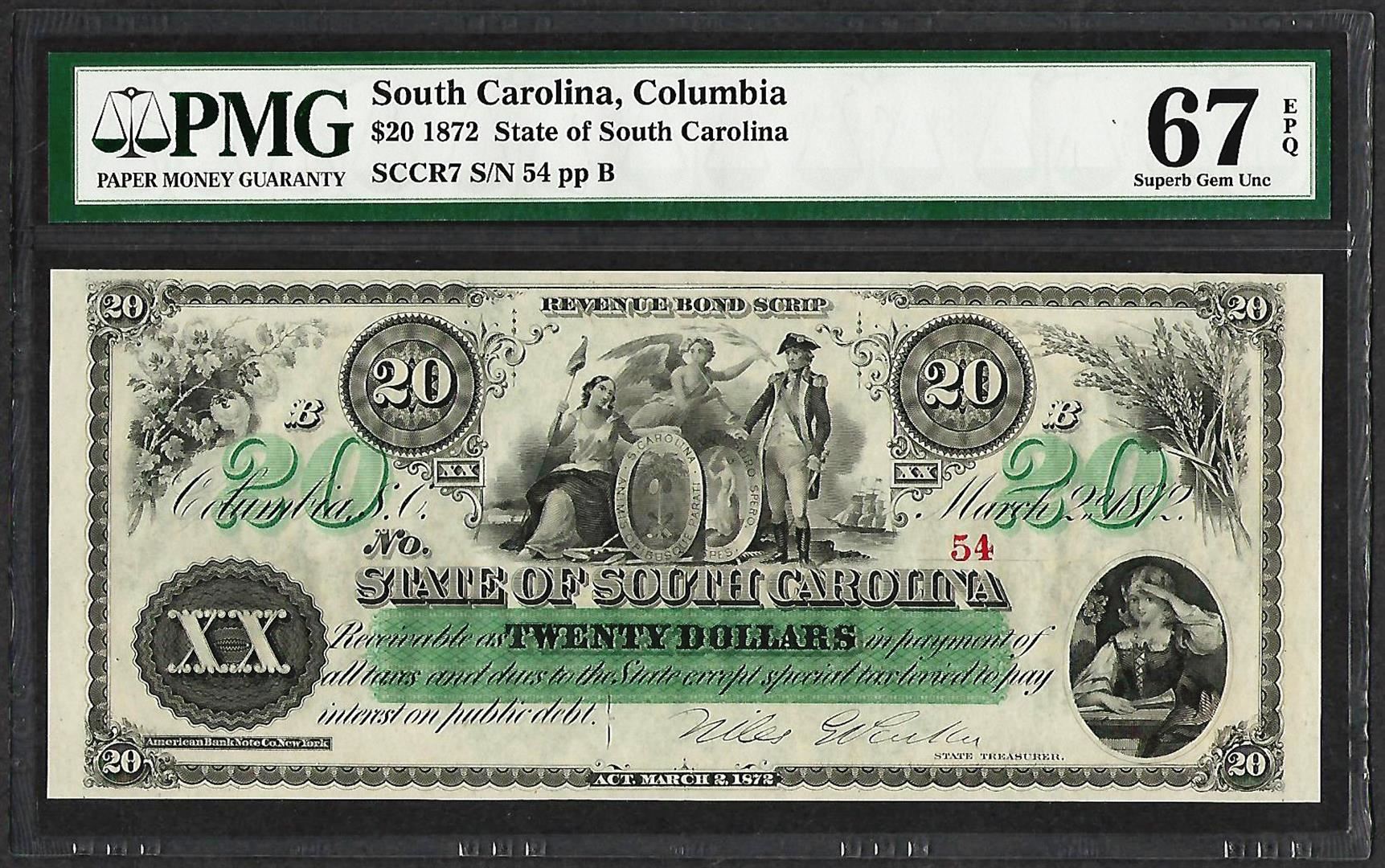 1872 $20 State of South Carolina Revenue Bond Obsolete Note PMG Superb Gem Unc. 67EPQ
