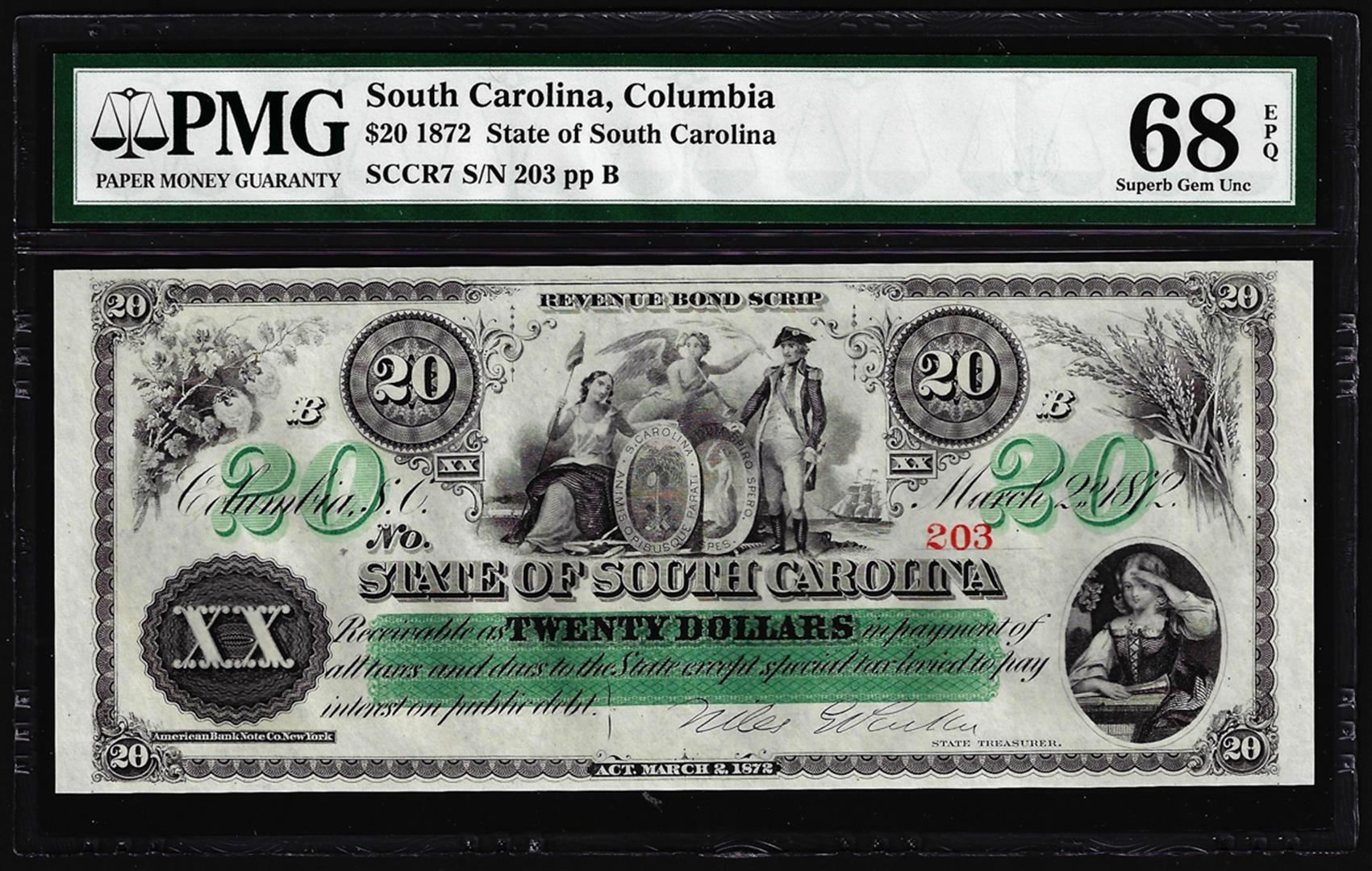 1872 $20 State of South Carolina Revenue Bond Obsolete Note PMG Superb Gem Unc. 68EPQ