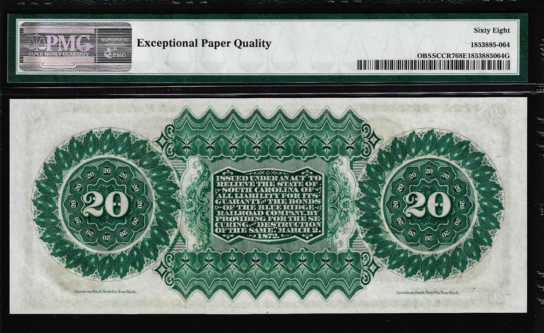 1872 $20 State of South Carolina Revenue Bond Obsolete Note PMG Superb Gem Unc. 68EPQ