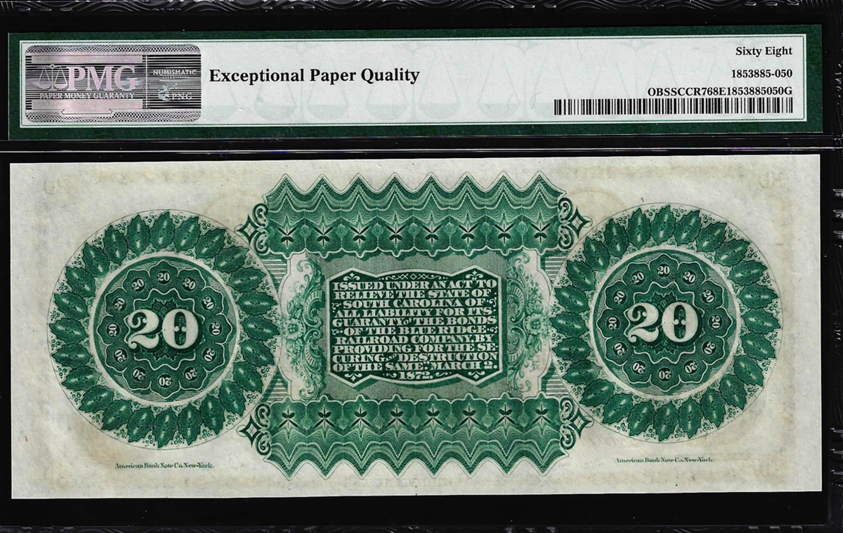 1872 $20 State of South Carolina Revenue Bond Obsolete Note PMG Superb Gem Unc. 68EPQ