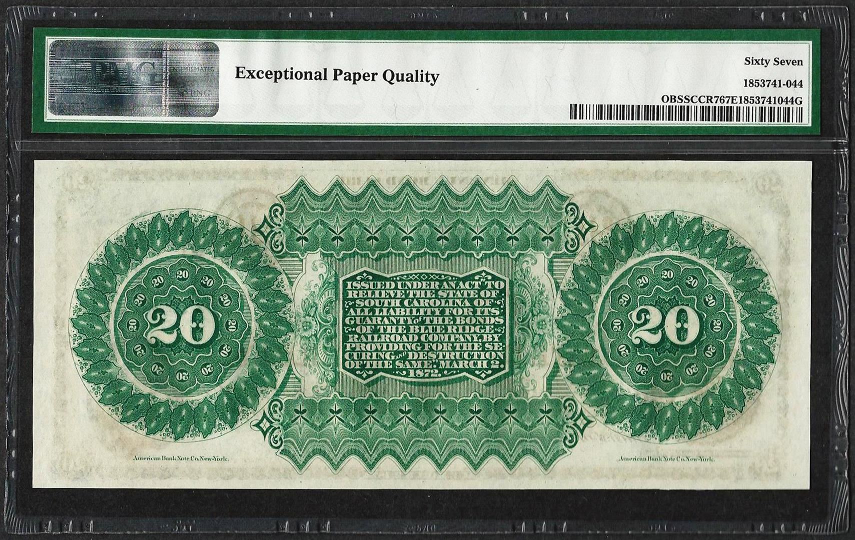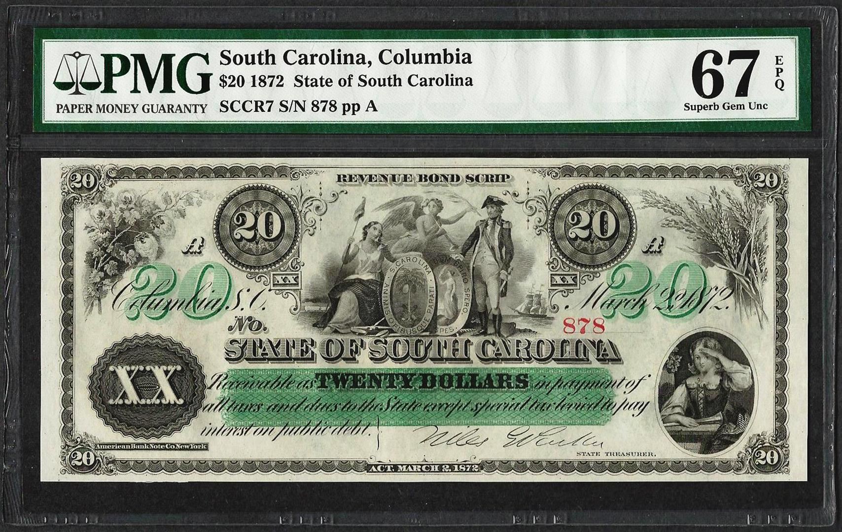 One 1872 $20 State of South Carolina Revenue Bond Obsolete Note PMG Superb Gem Unc. 67EPQ. PMG Certified.