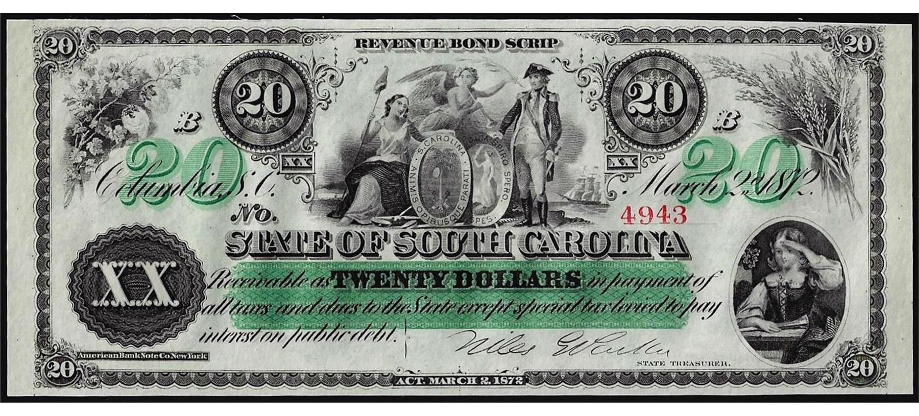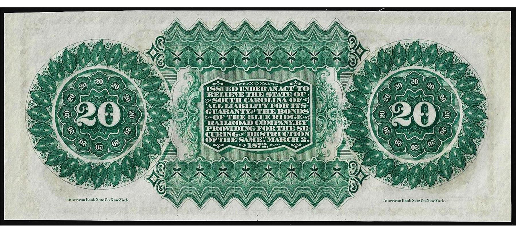 One 1872 $20 State of South Carolina Revenue Bond Obsolete Note.