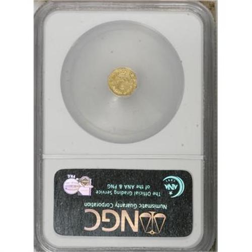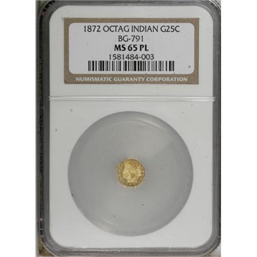 <B>1872 25C Indian Octagonal 25 Cents, BG-791, R.3, MS65 Prooflike NGC.</B></I> This mirrored California fractional gold piece is well preserved. The strike is sharp except for minor weakness on the fraction denominator. Slightly wavy, as made. Census: 7 in 65 Prooflike, 6 finer (5/07).<BR><BR><b>Shipping:</b> Coins & Currency (<a target="_blank" href="http://www.heritageauctions.com/common/shipping.php">view shipping information</a>)