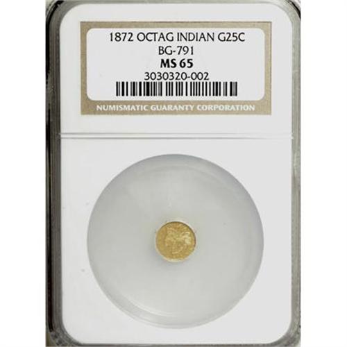<B>1872 25C Indian Octagonal 25 Cents, BG-791, R.3, MS65 NGC.</B></I> NGC Census: (10/5). PCGS Population (16/2). (#10618)<BR><BR><b>Shipping:</b> Coins & Currency (<a target="_blank" href="http://www.heritageauctions.com/common/shipping.php">view shipping information</a>)