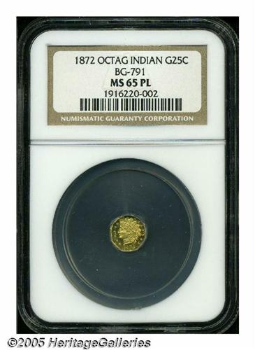 <B>1872<25C> Indian Octagonal 25 Cents, BG-791, R.3, MS65 Prooflike NGC.</B></I> The prooflike surfaces glow with green-gold color and powerfully struck devices. The grade is limited by a few small marks on the Indian's cheek and neck, and in the reverse fields.