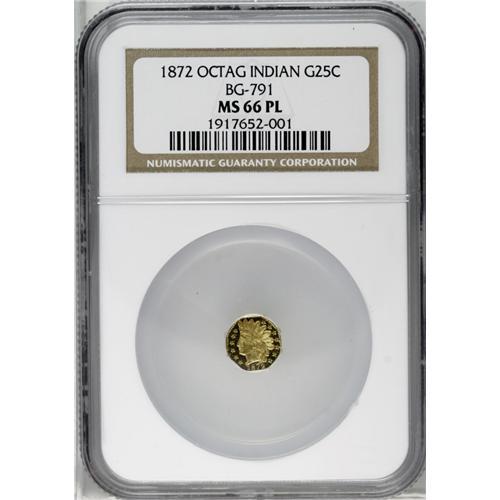 <B>1872<25C> Indian Octagonal 25 Cents, BG-791, R.3, MS66 Prooflike NGC.</B></I> A radiant example with nicely reflective fields and a precise strike throughout the devices. Only the denominator and the A in DOLLAR is not completely brought up by the dies.