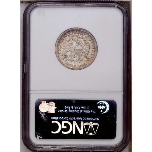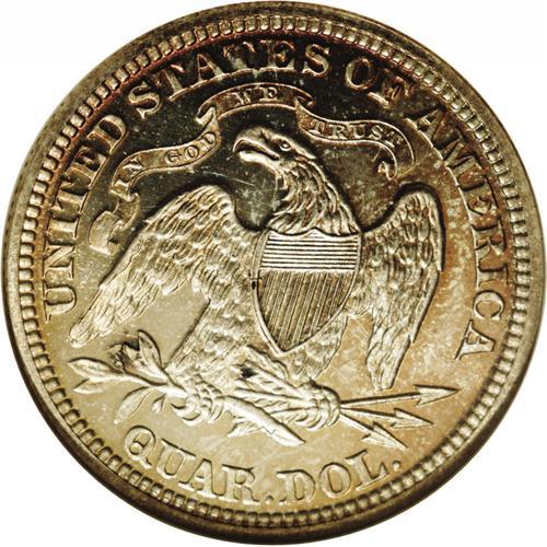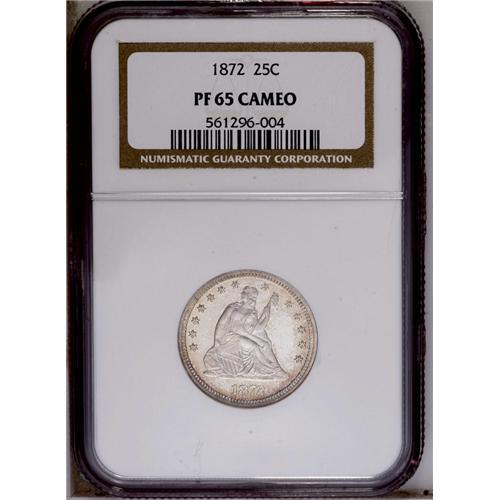 <B>1872<25C> PR65 Cameo NGC.</B></I> This coin has good eye appeal for the Cameo contrast between the frosted devices and mirror fields. Toned with a blush of coppery-gold in the fields with russet peripheral accents on the obverse, the reverse more evenly toned with variegated gold in the fields with a touch of rich crimson on the upper edge. A scarce coin in Gem grades, and this one has better surfaces and contrast than one might expect.