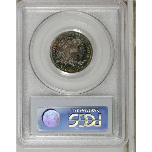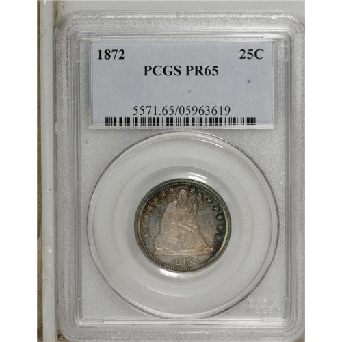 <B>1872 25C PR65 PCGS.</B></I> Lovely variegated toning includes deep shades of violet, gold, electric-blue and amber on the reverse. The obverse displays more subtle coloration, with the deeper iridescent hues appearing near the periphery. A crisply struck Gem proof, with untroubled surfaces and remarkable eye appeal. Population: 13 in 65, 7 finer (2/07).<BR><BR><b>Shipping:</b> Coins & Currency (<a target="_blank" href="http://www.heritageauctions.com/common/shipping.php">view shipping information</a>)