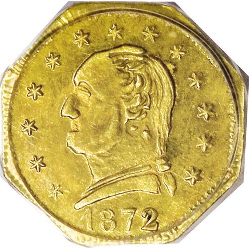 <B>1872 25C Washington Octagonal 25 Cents, BG-724, High R.6, MS62 PCGS.</B></I> The Small Date, Washington Head variety with berries on the reverse wreath. The luster is somewhat diminished by deep orange-gold patina, but there are few singular distractions, and the overall appeal is high for this rare variety. Population: 2 in 62, 5 finer (4/07).<BR><BR><b>Shipping:</b> Coins & Currency (<a target="_blank" href="http://www.heritageauctions.com/common/shipping.php">view shipping information</a>)