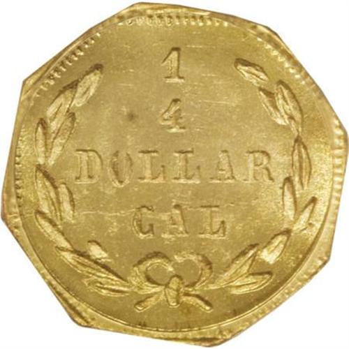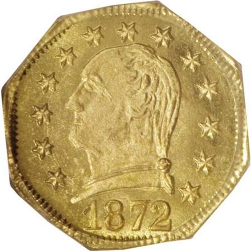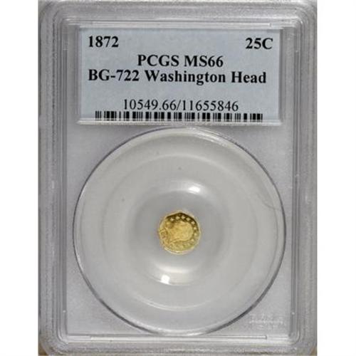 <B>1872 25C Washington Octagonal 25 Cents, BG-722, Low R.4, MS66 PCGS.</B></I> Bright yellow-gold surfaces possess a greenish cast, and display noticeable field-motif contrast. Well struck, with nicely preserved surfaces. Walter Breen and Ron Gillio (2003) write: "It would seem that in 1872 Frontier switched to a Washington Head obverse to avoid too much resemblance to the design of the U.S. gold dollar."<BR><BR><b>Shipping:</b> Coins & Currency (<a target="_blank" href="http://www.heritageauctions.com/common/shipping.php">view shipping information</a>)