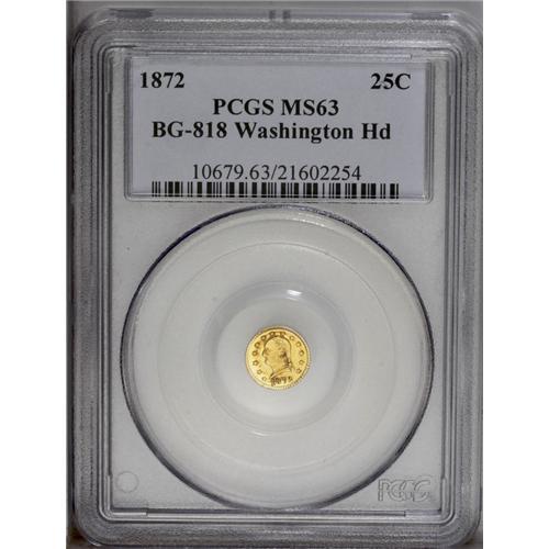 <B>1872<25C> Washington Round 25 Cents, BG-818, Low R.4, MS63 PCGS.</B></I> A yellow-gold example with hints of lemon on the obverse, and blushes of orange toning on the reverse field. Crisply struck, and impressive despite a thin mint-made horizontal planchet flaw to the right of the denominator. The Washington type stands out from the usual parade of Liberty and Indian heads.
