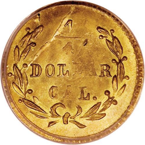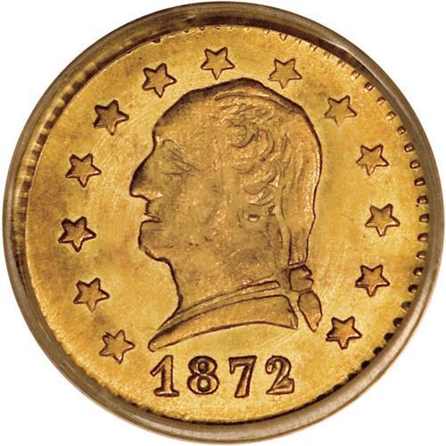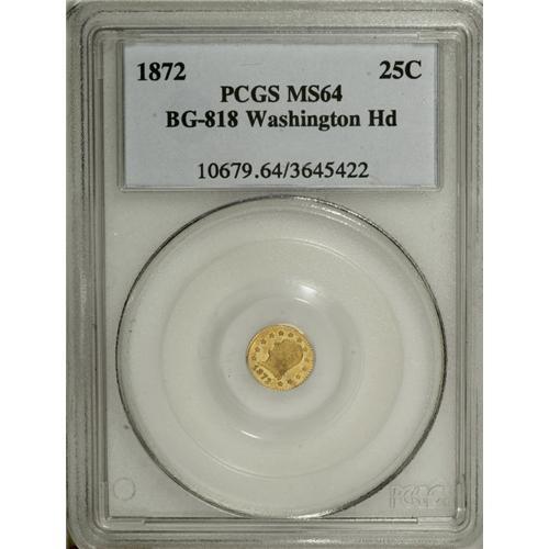 <B>1872 25C Washington Round 25 Cents, BG-818, Low R.4, MS64 PCGS.</B></I> The Washington portrait California small denomination gold varieties have long been popular with collectors, and provide a pleasant change of pace from the usual Indian and Liberty head types. A lustrous green-gold and orange near-Gem kept from a finer grade by a couple of laminations (as made) near the fraction.<BR><BR><b>Shipping:</b> Coins & Currency (<a target="_blank" href="http://www.heritageauctions.com/common/shipping.php">view shipping information</a>)