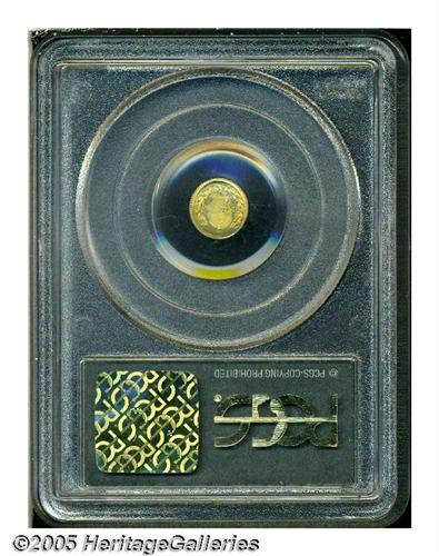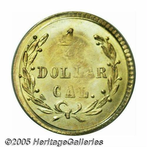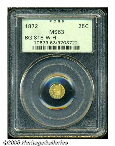 <B>1872<25C> Washington Round 25 Cents, BG-818, Low R.4, MS63 PCGS.</B></I> An important design that has appeal outside the immediate group of dedicated California Fractional Gold collectors. Those who collect Washingtoniana will have their eye on this example as well. Softly struck as usual. Rich yellow-gold with iridescent toning and frosty luster. A lovely example.