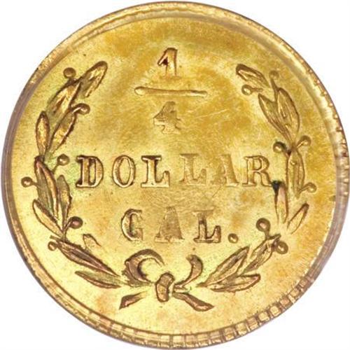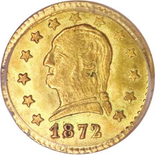 <B>1872 25C Washington Round 25 Cents, BG-818, Low R.4, MS64 PCGS.</B></I> A flashy green-gold near-Gem with exemplary preservation. The reverse center has a couple of lightly impressed letters, but the remainder of the devices are bold. Within the California small denomination gold series, the Washington type is a popular change of pace from the usual parade of Indian and Liberty heads. Encased in an old green label holder. Population: 31 in 64, 25 finer (8/07).<BR><BR><b>Shipping:</b> Coins & Currency (<a target="_blank" href="http://www.heritageauctions.com/common/shipping.php">view shipping information</a>)