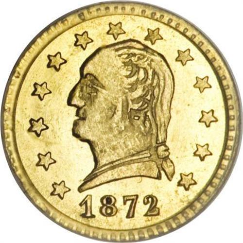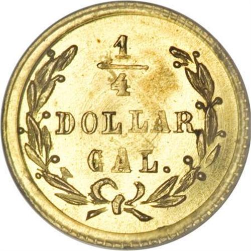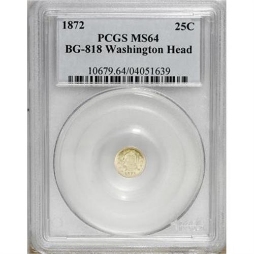 <B>1872 25C Washington Round 25 Cents, BG-818, Low R.4, MS64 PCGS.</B></I> A flashy yellow-gold near-Gem with exemplary preservation and near-prooflike surfaces. The reverse center has a couple of lightly impressed letters, but the remainder of the devices are bold. Within the California small denomination gold series, the Washington type is a popular change of pace from the usual parade of Indian and Liberty heads. <BR><BR><b>Shipping:</b> Coins & Currency (<a target="_blank" href="http://www.heritageauctions.com/common/shipping.php">view shipping information</a>)