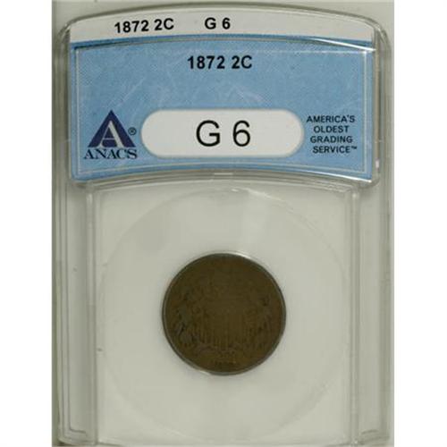 <B>1872 2C G6 ANACS.</B></I> NGC Census: (2/88). PCGS Population (4/133). Mintage: 64,000. Numismedia Wsl. Price for NGC/PCGS coin in G6 : $186. (#3612)<BR><BR><B>Coin Engraver:</B> James B. Longacre<BR><BR><b>Shipping:</b> Coins & Currency (<a target="_blank" href="http://www.heritageauctions.com/common/shipping.php">view shipping information</a>\)