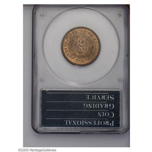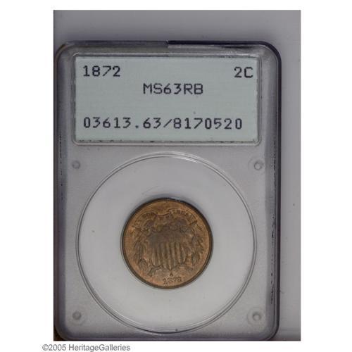 <B>1872<2C> MS63 Red and Brown PCGS.</B></I> The mintage for 1872 was a very low 65,000 pieces, and this coin is scarce in all grades, many collectors having to settle for a proof rather than a business strike. The surfaces here are softly struck and evenly mellowed on each side, with no contact marks or abrasions.