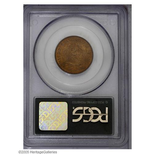 <B>1872<2C> MS64 Red and Brown PCGS.</B></I> FS-006. TRUST is nicely die doubled. The Two Cent denomination was launched in 1864 with sizable mintages, but production was reduced each year thereafter, and fell propitiously to a mere 65,000 pieces in 1872. Although proofs can be located without great effort, Mint State examples are rare. The present example has dusky orange color, with some brown toning on the lower obverse, and a few aqua flecks on the lower reverse. In a green label holder. Population: 29 in 64 Red and Brown, 6 finer (9/05).