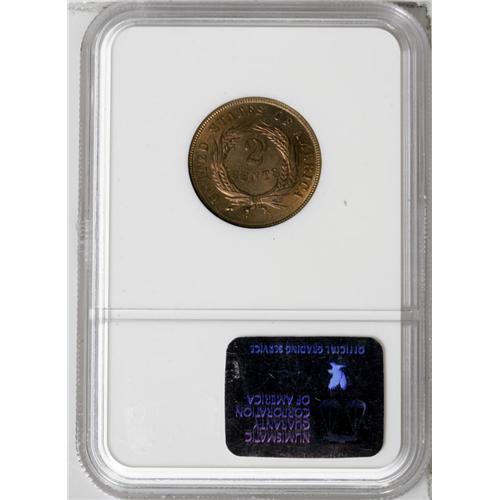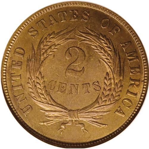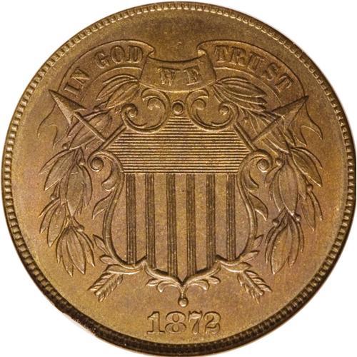 <B>1872<2C> MS65 Red and Brown NGC.</B></I> This low mintage emission of 65,000 business strikes is here represented by an attractive reddish-brown example that is well struck and lacks mentionable distractions. A few light die cracks join the peripheral stress points on the reverse.