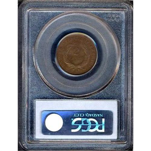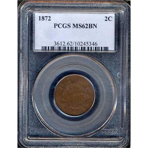 <b>1872 Two Cents. PCGS graded MS62 BR.</b> A very scarce year as only 65,000 were minted. Well worn examples can be found on occasion, but true Mint States like this handsome brown-colored specimen are actually more elusive than the Proofs <b>(PCGS # 3612)</b> <i>
