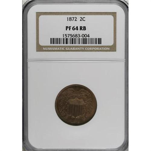 <B>1872 2C PR64 Red and Brown NGC.</B></I> An attractive example of the last proof two cent issue to have accompanying business strikes. The copper-orange of the obverse gives way to nutmeg and mahogany on the boldly impressed, modestly hairlined reverse.<BR><BR><B>Coin Engraver:</B> James B. Longacre<BR><BR><b>Shipping:</b> Coins & Currency (<a target="_blank" href="http://www.heritageauctions.com/common/shipping.php">view shipping information</a>)