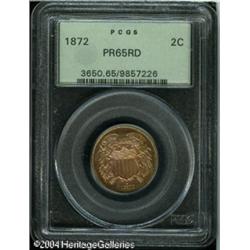 1872 2C PR65 Red PCGS. Coppery-gold color with a f <B>1872 2C PR65 Red PCGS.</B></I> Coppery-gold color with a few traces of pale violet and subdued red color. The surfaces display a near cameo-like effect. Population: 34 in 65, 13 finer (11/04). <BR><BR><B>Important notice:</B> Heritage usually auctions material at the rate of 200-250 lots per hour. On some occasions eBay Live bid software or the Internet may not be able to keep up with the pace of the auction. We recommend placing a realistic absentee bid now as insurance to avoid disappointment. Occasionally the auctioneer may eliminate or reject an eBay Live bid, and the auctioneer may also reopen a lot after the close of the eBay live bidding (usually because we missed an audience bid), and may reject your bid even if it shows you as the winning bidder. By bidding via eBay Live, you agree that Heritage may award the lot to another bidder at its sole discretion under the circumstances described above or any other reasonable circumstances. Since eBay bids are not shown to us until we open the lot on the floor, we treat those bids just like floor bids. In most cases the floor responds before the eBay bid is presented to us, due to Internet lag time, so for consistency we have made it a policy that floor bids are always considered first over tie eBay live bids. Also please note that all Heritage lots purchased through eBay Live carry a 20% Buyer's Premium. Please make sure you read the Terms and Conditions before you bid. This lot is being auctioned in conjunction with a live floor auction by Heritage Galleries & Auctioneers. All final auction and invoice information will be supplied by Heritage Galleries & Auctioneers, and all other information should be considered preliminary. Lot:5471