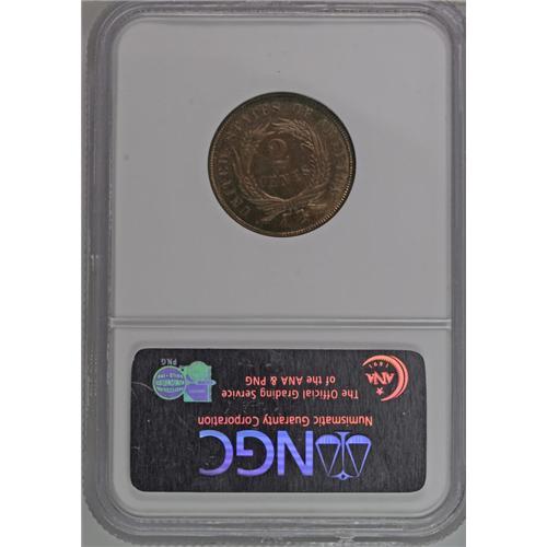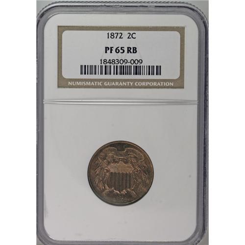<B>1872<2C> PR65 Red and Brown NGC.</B></I> This beautiful example displays surfaces of light rose and tan, embellished by attractive rich brown highlights. The low mintage of 950 pieces emphasizes the scarcity of this penultimate two cent issue. Census: 60 in 65, 34 finer (8/06).