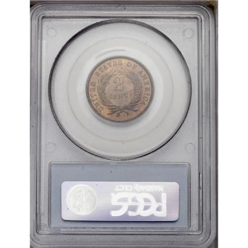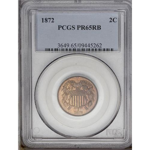 <B>1872<2C> PR65 Red and Brown PCGS.</B></I> Proof examples of this rare date are in demand due to the elusive nature of high quality business strikes. This example has lovely orange-brown color with hints of lilac toning. A few tiny specks are noted, but the surfaces are finer than usual, even at the Gem grade level.