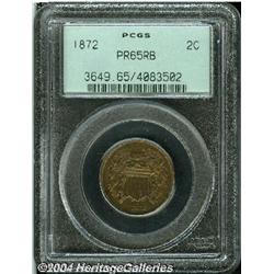 <B>1872<2C> PR65 Red and Brown PCGS.</B></I> Bright gold color illuminates protected areas of this boldly struck Gem. Variegated violet-brown patina fills the reverse center. A few carbon flecks, but unabraded. 1872 proofs are sought because of the scarcity of business strikes bearing the date.<BR><I>From The Dr. Gary Hogg Collection.</B></I> <BR><BR><B>Important notice:</B> Heritage usually auctions material at the rate of 200-250 lots per hour. On some occasions eBay Live bid software or the Internet may not be able to keep up with the pace of the auction. We recommend placing a realistic absentee bid now as insurance to avoid disappointment. Occasionally the auctioneer may eliminate or reject an eBay Live bid, and the auctioneer may also reopen a lot after the close of the eBay live bidding (usually because we missed an audience bid), and may reject your bid even if it shows you as the winning bidder. By bidding via eBay Live, you agree that Heritage may award the lot to another bidder at its sole discretion under the circumstances described above or any other reasonable circumstances. Since eBay bids are not shown to us until we open the lot on the floor, we treat those bids just like floor bids. In most cases the floor responds before the eBay bid is presented to us, due to Internet lag time, so for consistency we have made it a policy that floor bids are always considered first over tie eBay live bids. Also please note that all Heritage lots purchased through eBay Live carry a 20% Buyer's Premium. Please make sure you read the Terms and Conditions before you bid.