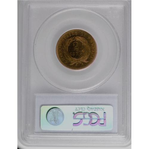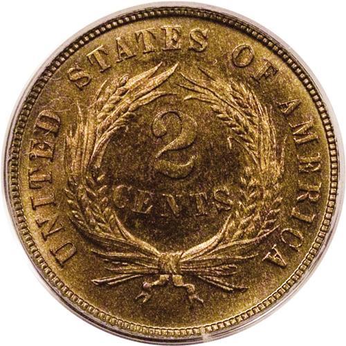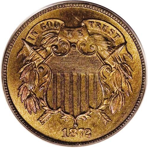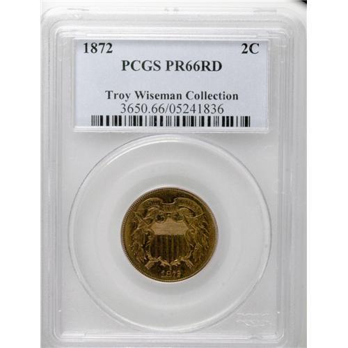 <B>1872<2C> PR66 Red PCGS.</B></I> A semikey to the two cent series, the 1872 issue was produced to the extent of only 65,000 business strikes, whose elusiveness in all grades places extra demand on the 950 proof examples minted. While still congruent with the Red designation, the fields on the present coin show pretty orange-gold hues, deepening to carmine near the obverse rim. A boldly struck, distraction-free, and eye-appealing specimen. Population: 12 in 66 Red, 1 finer (8/06).<BR><I>From The Troy Wiseman Collection.</B></I>