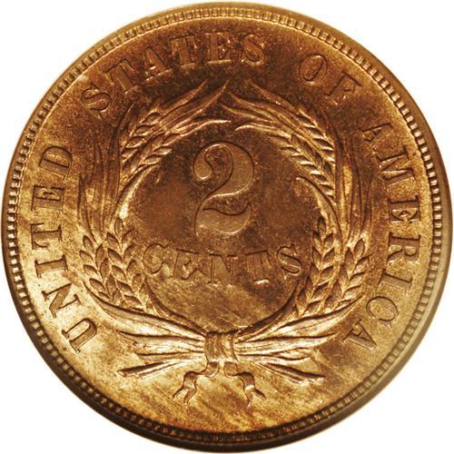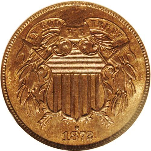 <B>1872<2C> PR66 Red and Brown NGC.</B></I> A remarkable proof example of this elusive date with considerable original orange mint color and pale brown toning. Both sides are accented by wispy blue color. Given the rarity of Gem quality business strikes, this proof example serve as an excellent addition to nearly any set of these coins. While the strike and reflectivity of this Gem clearly indicate its proof status, the surfaces are not deeply mirrored, but display satiny luster. Census: 29 in 66, 4 finer (4/06).