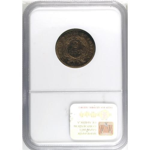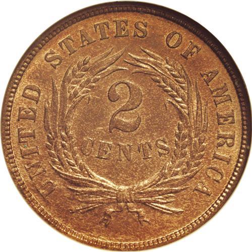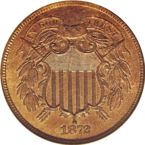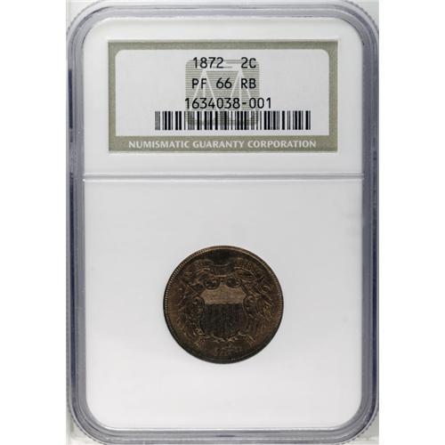 <B>1872<2C> PR66 Red and Brown NGC.</B></I> Two cent production fell to just 65,000 coins in 1872, perhaps 950 pieces of which were proofs. The scarcity of well preserved business strikes in today's market has resulted in considerable date pressure being brought to bear on the extant proofs. This is among the finest Gems that we have handled, and it is a mostly lustrous, orange-red coin with some delicate glossy-brown overtones. The fully brought-up features are silky-smooth from rim to rim. Census: 29 in 66, 4 finer (6/06).