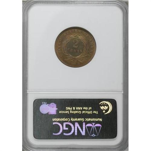 <B>1872 2C PR66 Red and Brown NGC.</B></I> A visually interesting Premium Gem that offers lovely, lively lemon-orange surfaces overall with a slight duskiness to the obverse. Rose and walnut shadings visit the margins of this late-date two cent proof. Census: 32 in 66 Red and Brown, 4 finer (11/07).<BR><BR><B>Coin Engraver:</B> James B. Longacre<BR><BR><b>Shipping:</b> Coins & Currency (<a target="_blank" href="http://www.heritageauctions.com/common/shipping.php">view shipping information</a>)