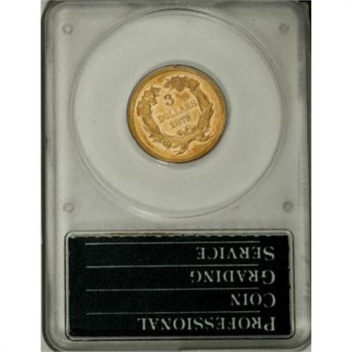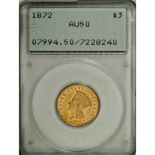 <B>1872 $3 AU50 PCGS.</B></I> A surprisingly scarce date that can remain on want lists for long periods of time. Just 2,000 of these pieces were first coined, and only a small percentage survives. This piece, in a first generation holder, has brilliant lemon-yellow color with reflective fields.<BR><BR><B>Coin Engraver:</B> James B. Longacre<BR><BR><b>Shipping:</b> Coins & Currency (<a target="_blank" href="http://www.heritageauctions.com/common/shipping.php">view shipping information</a>)