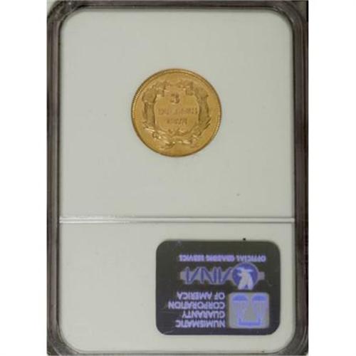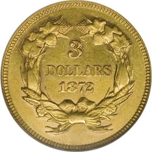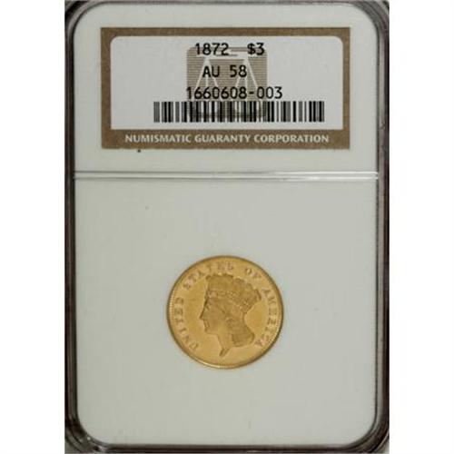 <B>1872 $3 AU58 NGC.</B></I> Survivors from this issue's small emission (2,000 coins plus 30 proofs) issue are rare, as Bowers puts it "no doubt due to Thomas L. Elder and others who sought these from bank tellers during the early 20th century, at which time they commanded a small premium on the numismatic market." Traces of prooflikeness are, unsurprisingly, seen in the recesses of this attractive business strike, with just a trace of rub that separates it from Mint State. The greenish-gold surfaces show good eye appeal and no singular impairments. Census: 55 in 58, 27 finer (6/07).<BR><BR><B>Coin Engraver:</B> James B. Longacre<BR><BR><b>Shipping:</b> Coins & Currency (<a target="_blank" href="http://www.heritageauctions.com/common/shipping.php">view shipping information</a>\)