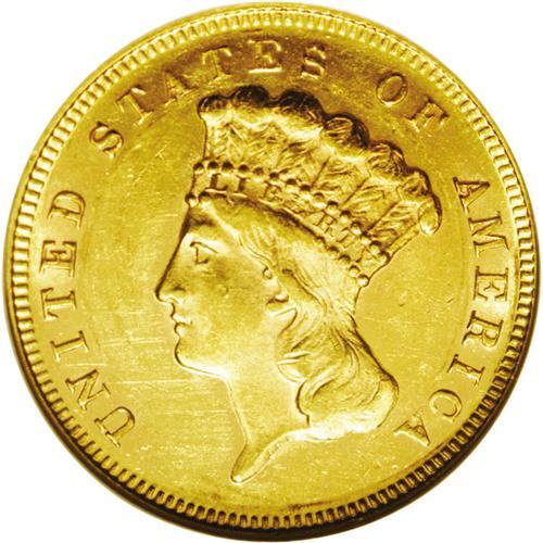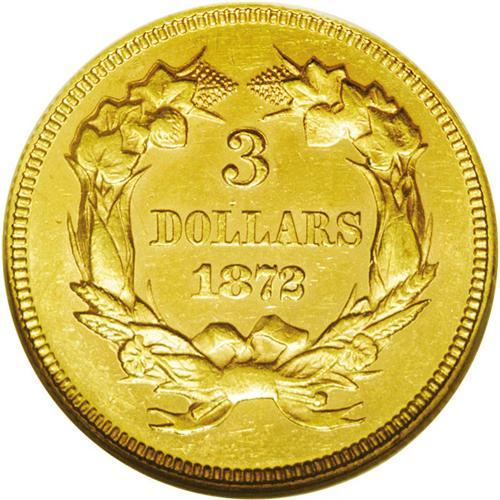 <B>1872<$3> AU58 Prooflike NGC.</B></I> The 1872 is another rare date within the difficult three dollar gold series. Only 2,000 business strikes and 30 proofs were coined. This flash example has a touch of wear on the wreath ribbon and Liberty's eyebrow, but luster is substantial and no relevant marks are found. A shallow strike-through affects the E in LIBERTY. Census: 2 in 58 Prooflike, 4 finer (4/06).