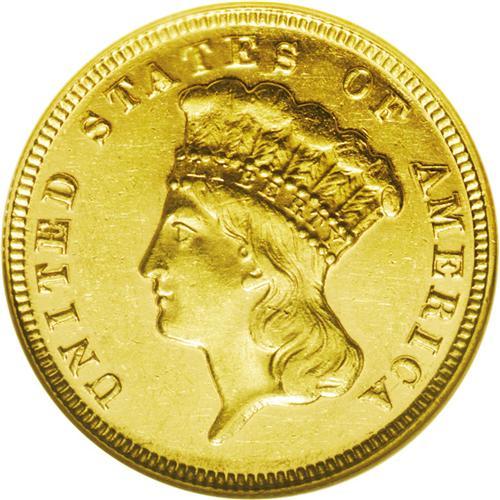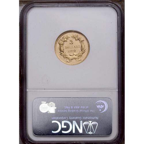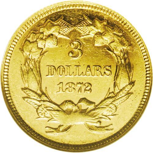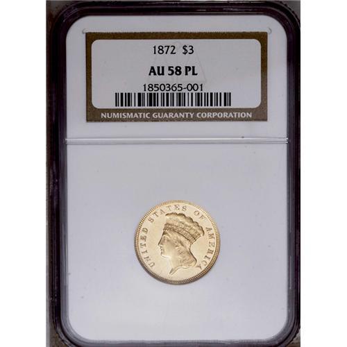 <B>1872<$3> AU58 Prooflike NGC.</B></I> The prooflike qualities exhibited here are no surprise for this issue of 2,000 business strikes. Neither is the minimal wear, as approximately half the surviving 1872 threes fall under the AU (50 to 58) grade range. Scattered marks on each side are heightened by the glassy surfaces.