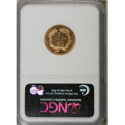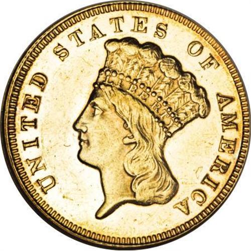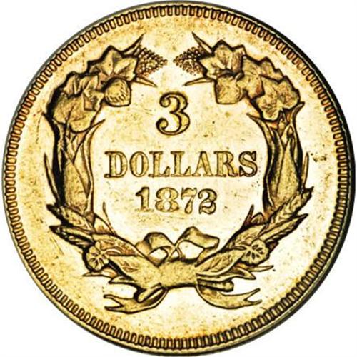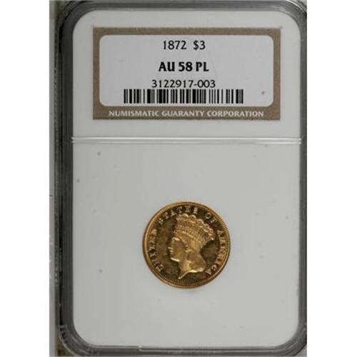<B>1872 $3 AU58 Prooflike NGC.</B></I> The 1872 is a low-mintage (2,000 circulation strikes) rare date. We offer here a lightly circulated specimen that displays attractive apricot-gold color and a minimum of circulation marks. An attentive strike delineates the design elements that are nicely highlighted by the mirrored fields. <BR><BR><B>Coin Engraver:</B> James B. Longacre<BR><BR><b>Shipping:</b> Coins & Currency (<a target="_blank" href="http://www.heritageauctions.com/common/shipping.php">view shipping information</a>)